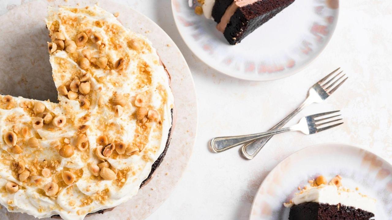 Chocolate-hazelnut cream cake with a whipped ganache filling; Swedish "sticky" chocolate cake topped with a flavored whipped cream.